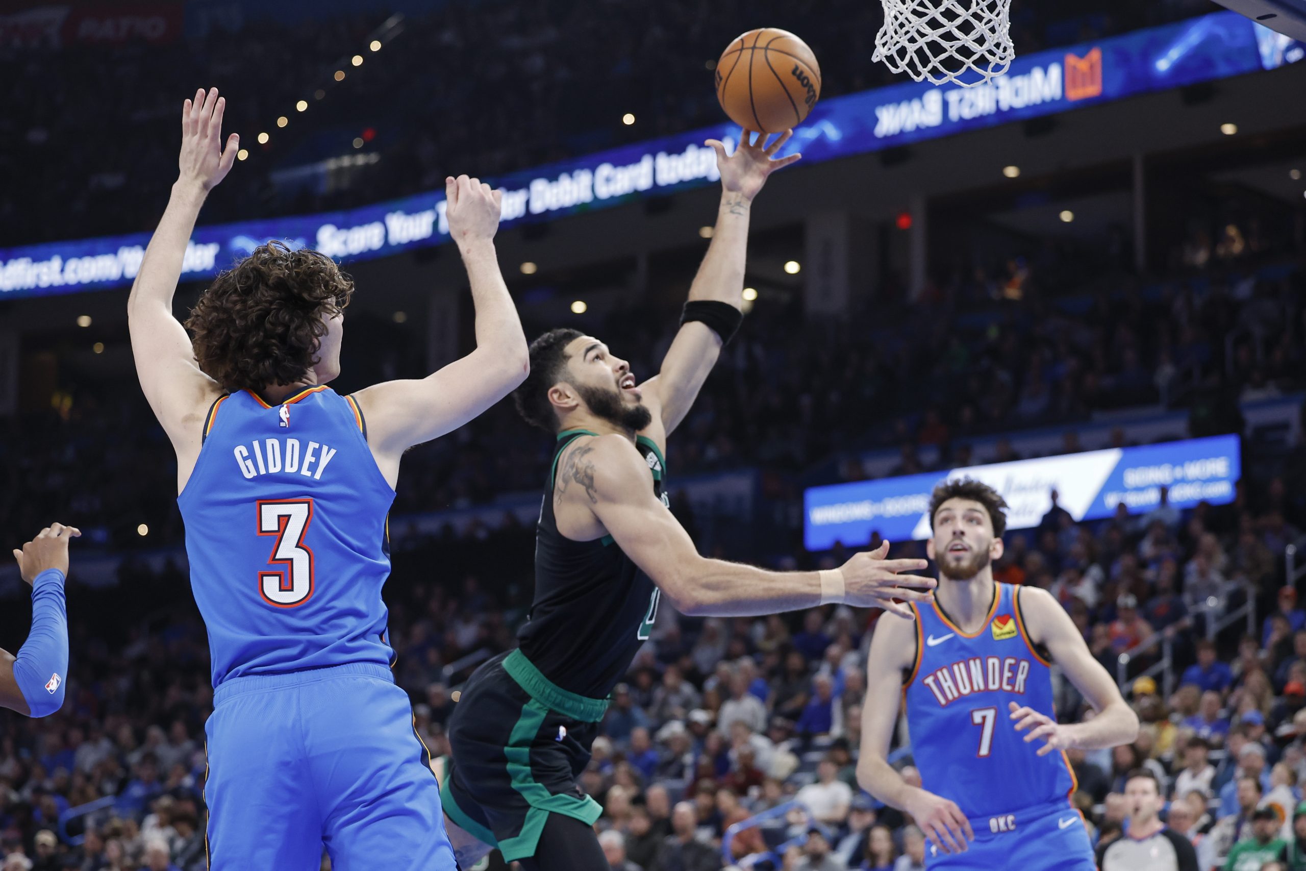 Jan 2, 2024; Oklahoma City, Oklahoma, USA; Boston Celtics forward Jayson Tatum (0) goes to the basket between Oklahoma City Thunder guard Josh Giddey (3) and forward Chet Holmgren (7) during the second half at Paycom Center. Mandatory Credit: Alonzo Adams-USA TODAY Sports