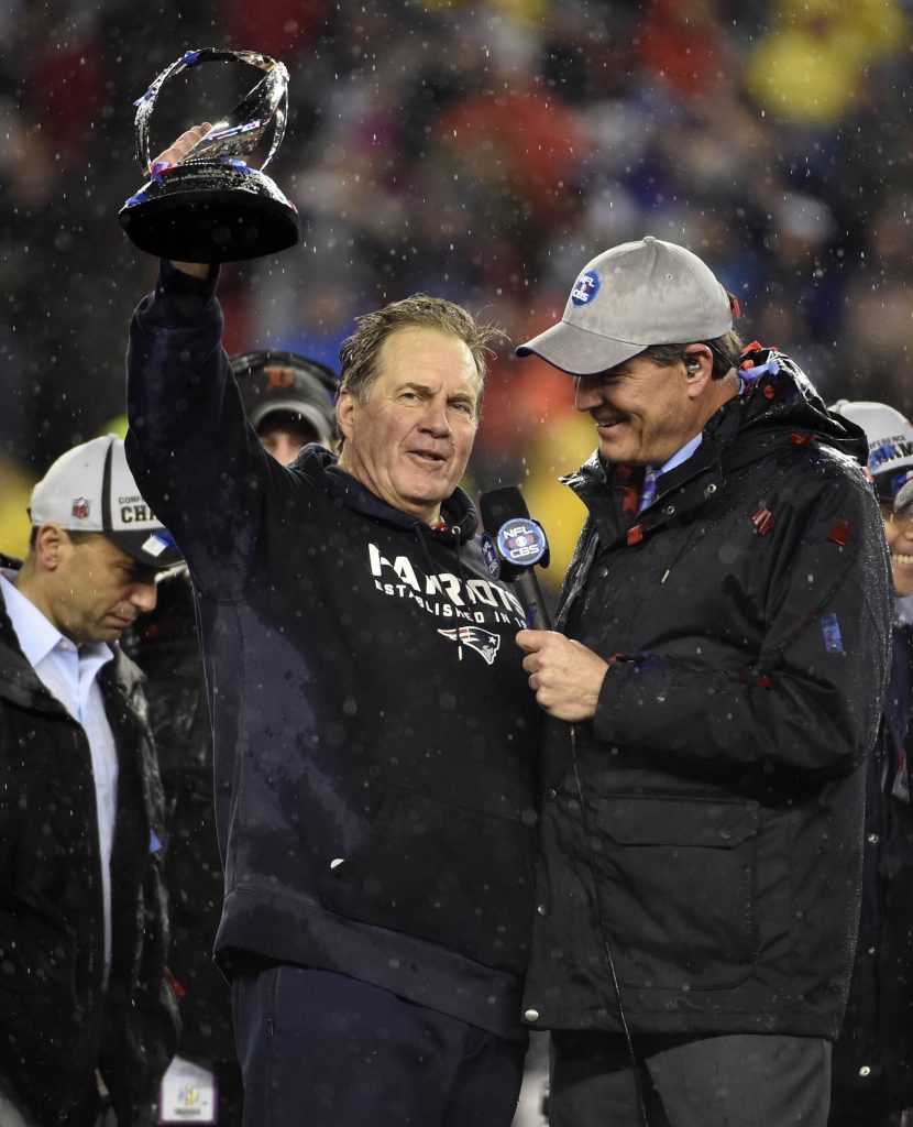 After accepting the Lamar Hunt Trophy postgame, Belichick emphatically told CBS’ Jim Nantz, “We’re on to Seattle,” harkening back to his headline-grabbing quote from earlier in the season.