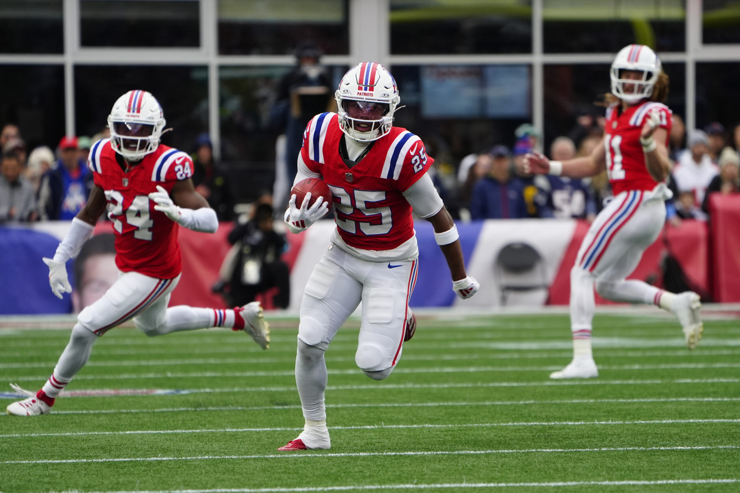 Oct 13, 2024; Foxborough, Massachusetts, USA; New England Patriots cornerback Marcus Jones (25) returns a punt against the Houston Texans during the first half at Gillette Stadium. Mandatory Credit: Gregory Fisher-Imagn Images