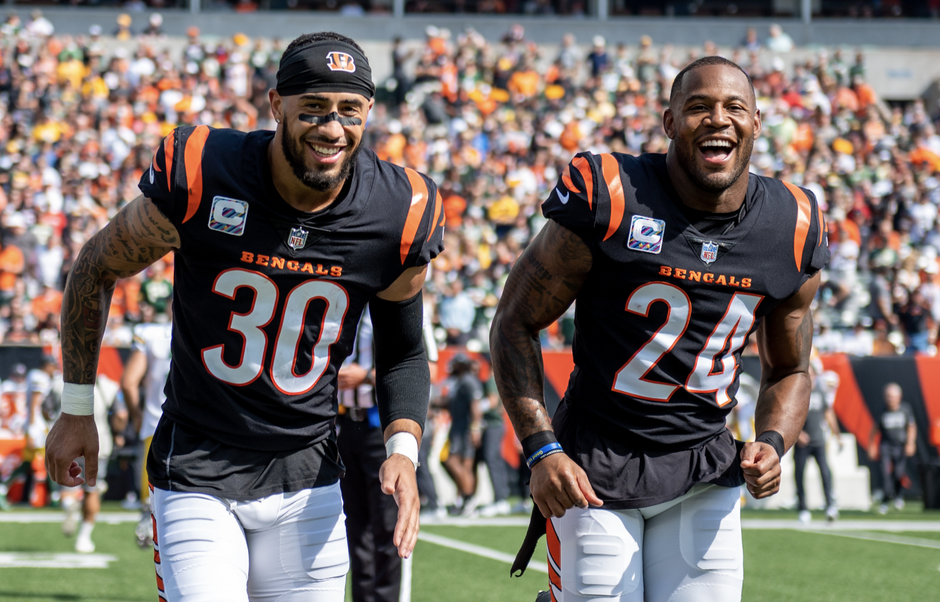 Jesse Bates, Vonn Bell and the Bengals hope to be all smiles following Sunday's game in Detroit.