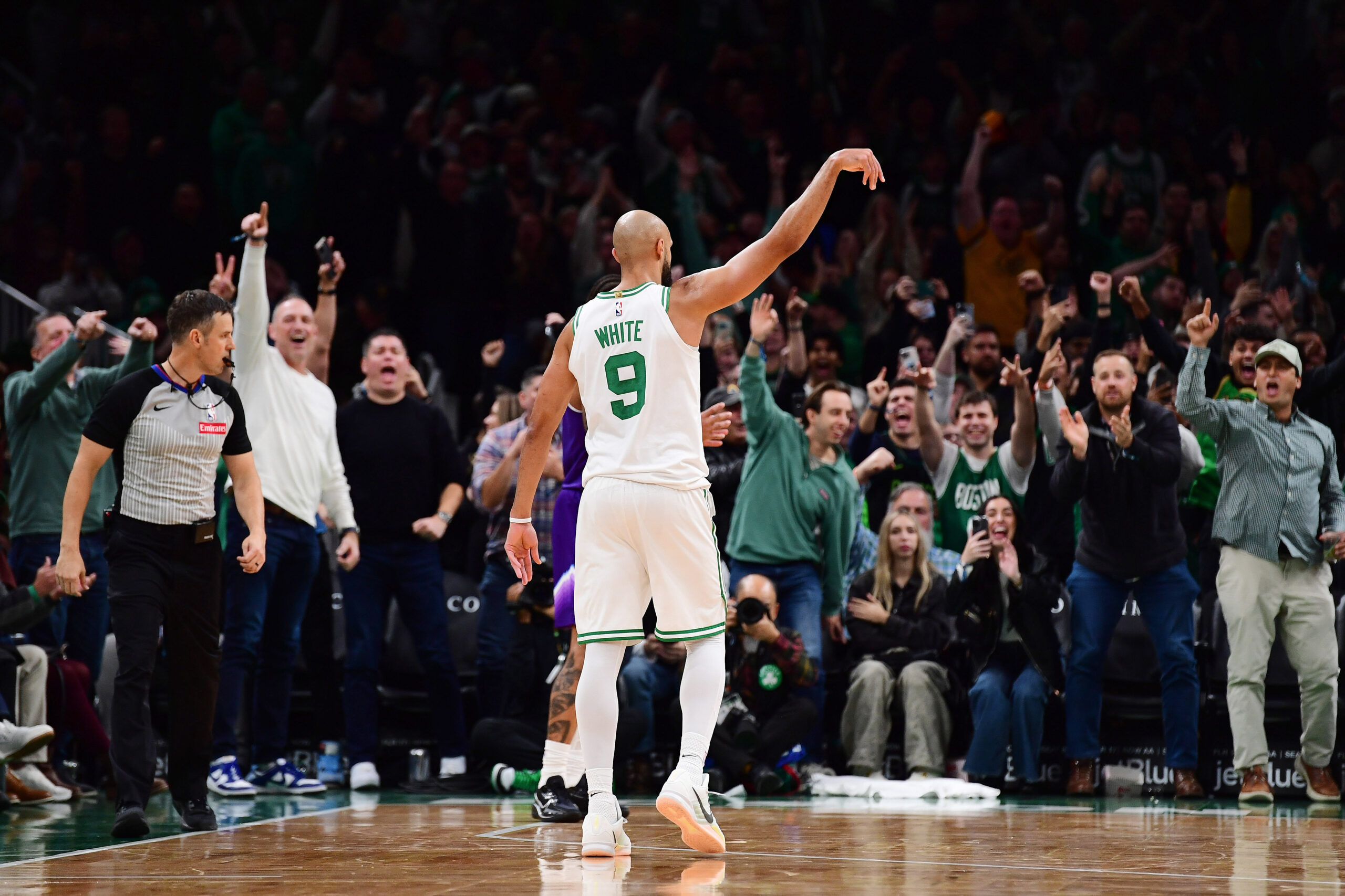 Nov 3, 2025; Boston, Massachusetts, USA; Boston Celtics guard Derrick White (9) reacts after making a three point basket during the second half against the Utah Jazz at TD Garden. Mandatory Credit: Bob DeChiara-Imagn Images