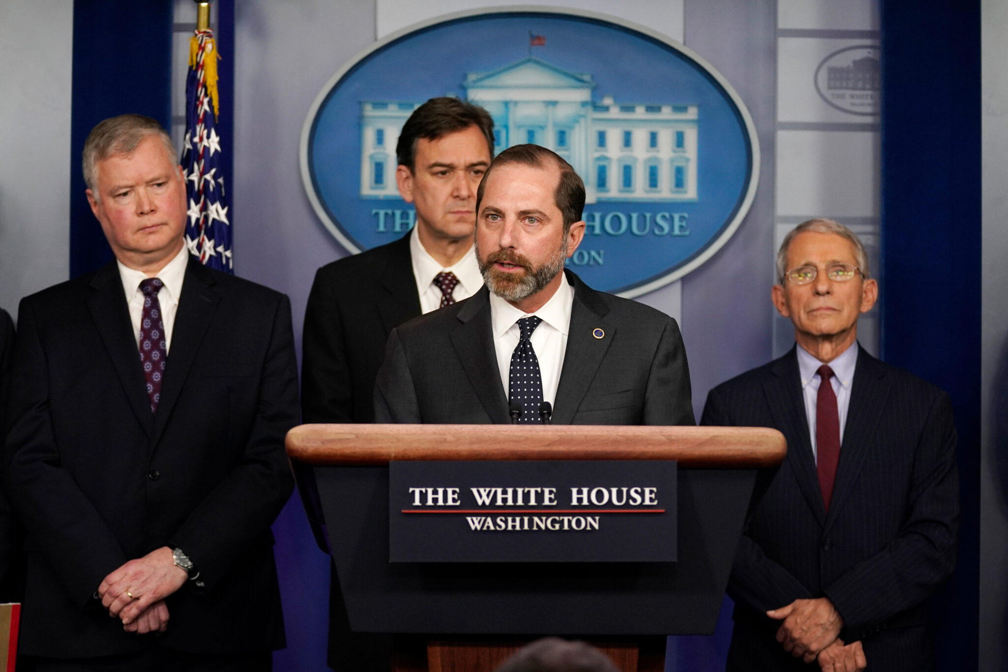 Health and Human Services Secretary Alex Azar declared the novel coronavirus a public health emergency in the United States, Washington D.C., Friday. From left are Department of Transportation, Deputy Secretary of State Stephen Biegun, Joel Szabat, Acting Under Secretary for Policy, Azar, and National Institute of Allergy and Infectious Diseases Director Anthony Fauci.